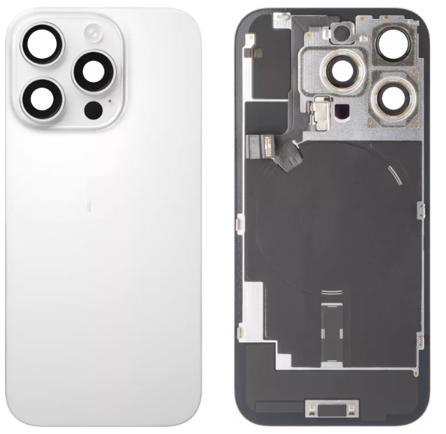 Apple iPhone 16 Pro This is only the backcover glass plate, it’s not the complete backcover/housing. – With Camera Frame + Iron Plate + NFC Magnet – White
