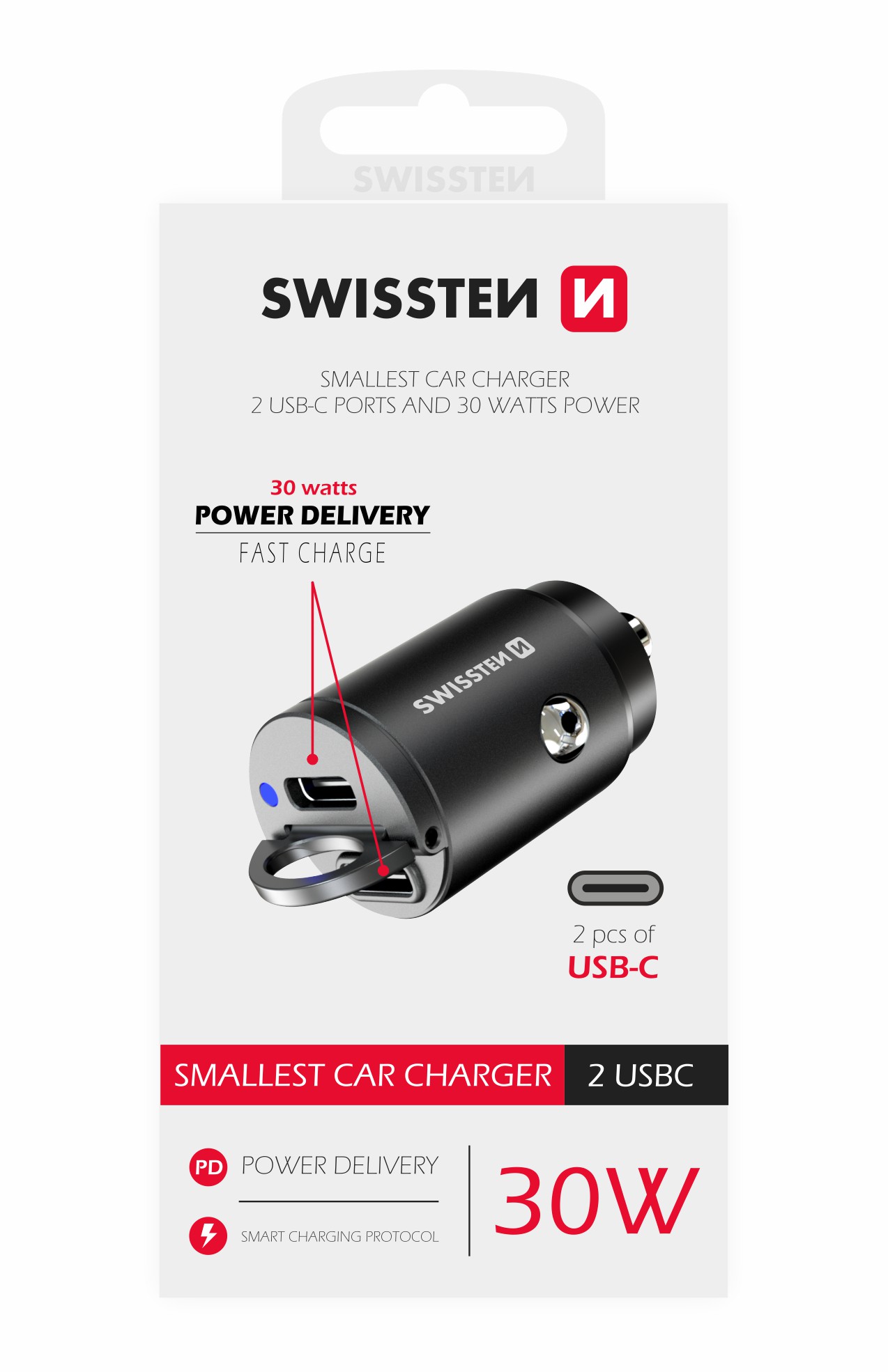 Nano car charger SWISSTEN with 2x USB-C Power Delivery outputs with a total output power of 30W. Packed in SWISSTEN retail pack.