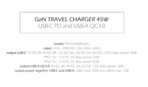 - USB-C PD: 5V DC 3A, 12V DC 3A, 15V DC 3A, 20V DC 2.25A / Max. power: 45W