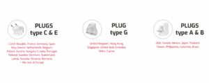 - Plug Type G: United Kingdom (England, Scotland, Wales, Northern Ireland), Hong Kong, Singapore, United Arab Emirates (Dubai, Abu Dhabi), Malta, Cyprus