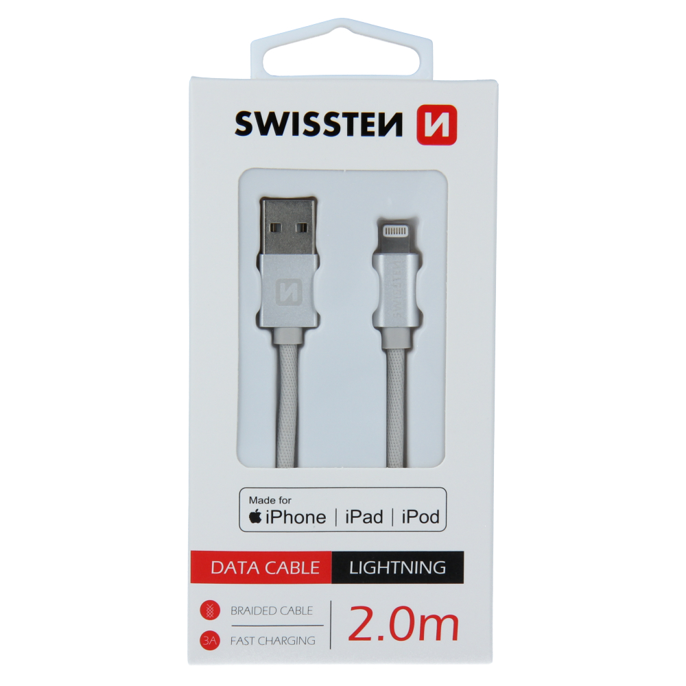 High quality textile data cable USB / Lightning MFi (licence MFi) with length of 2,0 m. The cable reinforced to deliver a higher current (up to 3A) and can handle fast 480 Mb/s data transfer. Packed in Swissten retail pack.