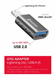 SWISSTEN OTG ADAPTER LIGHTNING(M)/USB-A(F) is used for connection of accessories with USB-A connector to device with lightning input. Packed in SWISSTEN retail packaging. 8595217478909